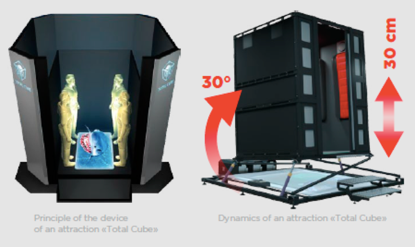 «Total Interactive Technologies Group» is pleased to present you an update version of unique and exciting attraction «Total Cube» which is the pride of our company. We believe that it will be a best-seller in virtual entertainment. Our steady partisanship to quality and strict adherence to high standards allowed us to create and then improve our unique compact entertainment complex. Innovative technology combined with exciting show put the viewer in a realistic atmosphere of «Total Cube». Requirements for installation: Minimum dimensions of the area: Length: 4,0 m Width: 3,0 m Height: 3,2 m Power supply: Mains voltage: 380 В, 3 phase Power consumption: 2 ÷ 7 KW Load on the floor: Static: 165 kg/m2 Dynamic: 340 kg/m2 Configurations: External dimensions: Length: 3650 mm Width: 3210 mm Height: 3200 mm Weight of attraction: Weight without visitors: 1400 kg Weight with visitors: 1720 kg Equipment delivery Remote control system: Touch terminal control: 1 pcs. CCTV system: 1 pcs. Visitor management system (e-mail or SMS-statistics): 1 pcs. Remote emergency stop: 1 pcs. Computer station: Station to play stereo movies: 1 pcs. Uninterruptible power supply (2000 W): 1 pcs. Rack: 1 pcs. Software: OS «Windows 7»: 2 pcs. The software package «Cinema Tracker - 5D»: 1 pcs. Projection system (active stereo): Projector: 1 pcs. Stereo glasses XpanD: 10 pcs. Batteries for stereo glasses XpanD: 10 pcs. Projection screen: 1 pcs. IR Emitter: 2 pcs. Speaker system 4.1: Amplifier: 1 pcs. Speakers: 4 pcs. Subwoofer: 1 pcs.