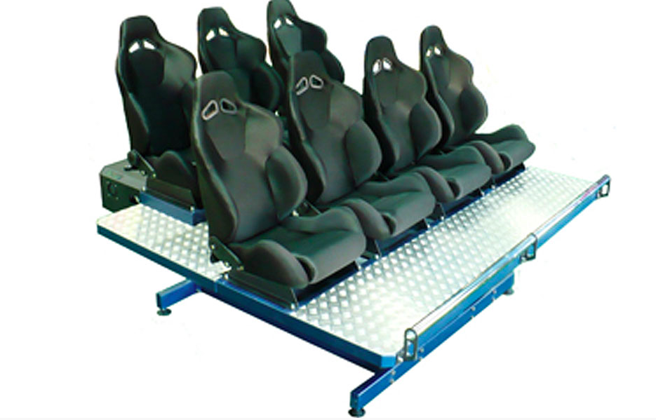 New generation of 3D theaters, the one and only theaters without screen, working on VR glasses and using unique HydroDynamical platforms. We are also producing movies for our theaters. 4D theaters are based on motion platforms with hydro mechanical construction. Platforms have from four to seven seats (contour chairs). The platforms are placed in front of the screen which creates an effect of presence for the audience with the help of space motion. Broadcasting of 3D films to the big screen is carried out with the help of special system – computer station, video projector and a set of active stereo glasses. Usage of patented solutions in hydraulic platforms’ construction provides an opportunity to simulate different complex motion with fast reverse, acceleration, strikes and vibration. System’s safety guarantees its correct functioning non-stop even with high capacities. Software package “Cinema Tracker 5” is supplied together with equipment. It has a wide range of tools and allows to regulate all parameters of platform motion: acceleration, speed, amplitude and to customize special effects (water spray, wind blowing, light flashing, etc.). Besides, «Cinema tracker 5» leads statistics of theater starts and takes pictures of each show. The show is operated by a specialist through remote touch-screen terminal with the help of simple and convenient client-oriented interface. A specialist operates an attraction while its safety is provided by infrared video control system and remote stop control. «Total Interactive Technologies» provides warranty and after-warranty service for each equipment set, together with supplying clients with new video content. Number of seats: 4/5/7 Requirements for installation Minimum room size: Length: 4,0 m Width: 3,5 m Height: 2,7 m Power supply: Mains voltage: 380 V or 220 V (depending on the equipment version) Power consumption: 2 ÷ 7 KW (average) Load on the floor: Static: 230 kg/m2 Dynamic: 345 kg/m2 Configurations External dimensions: Length: 1,2 m Width: 2,4 m Height: 1,6 m Height of the dynamic area: 0,45 m Weight of attraction: Weight without visitors: 300 kg Weight with visitors: 620 kg Dynamic parameters of the platform: Amplitude of motion: ± 15° Total vibration: up to 10 Hz Equipment delivery Dynamic platform: Prefabricated metal frame for 4 chairs - «2D4» (2 degrees of freedom): 1 pcs. Chairs: 4 pcs. Hydraulic actuator: 2 pcs. The central control unit of platform: 1 pcs. Podium (steps): 1 pcs. Remote ñontrol system: Controlling terminal (touch screen): 1 pcs. CCTV system: 1 pcs. Visitor management system (e-mail or SMS-statistics): 1 pcs. Remote Emergency Stop: 1 pcs. Computer station: Station to play stereo movies: 1 pcs. Uninterruptible power supply (2000 W): 1 pcs. Rack: 1 pcs. Software:: OS «Windows 7»: 2 pcs. The software package «Cinema Tracker - 5D»: 1 pcs. Projection system (active stereo): Projector (type is selected depending on the size of the room): 1 pcs. Stereo glasses XpanD: 8 pcs. Batteries for stereo glasses XpanD: 8 pcs. Projector mount: 1 pcs. Projection screen (the size depends on the size of the room): 1 pcs. IR Emitter: 1 pcs. Speaker system 5.1: Amplifier: 1 pcs. Front speakers (250 W): 2 pcs. Rear speakers (120 W): 2 pcs. Center speaker (120 W): 1 pcs. Subwoofer (400 W): 1 pcs. Effects: Wind (stage fans): 2 pcs. Water (automatic dispensers): 2 pcs. Flash lightning (stroboscope): 1 pcs. Effects to order: Mice Smoke Bubbles and snow Documentation: Manual Certificate 3D stereo films are selected from the collection